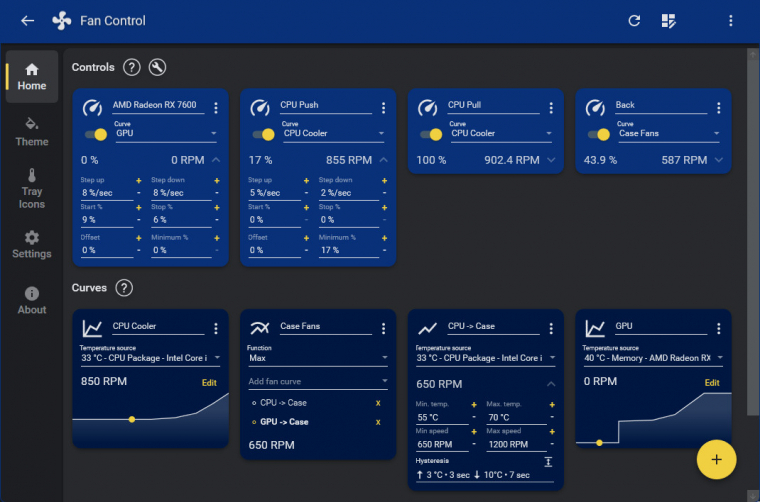 A hardver egészségét mindenekelőtt a ventilátorok garantálják, hiszen ezek szellőztetik át a házat, és gondoskodnak arról, hogy se a processzor, se a videokártya, se az alaplap, se az adattárolók ne melegedjenek túl. Noha minden alaplaphoz jár saját szoftver a légkavarók sebességének beállításához, ezek a szoftverek jellemzően lassúak és kevés beállítási lehetőséget nyújtanak. A Fan Control viszont minden tud, amire csak szükséged lehet: alaplaptól függetlenül kezeli az összes csatlakoztatott ventilátort, így nemcsak a processzor légkavaróját (vagy a vízhűtés pumpáját) tudod dinamikusan állítani, hanem az összes ventilátorét. Ráadásul nincs olyan megkötés sem, hogy a processzorhűtő sebessége csak a processzor hőmérsékletétől, a SYS csatlakozóra dugott légkavaró sebessége pedig a rendszer hőmérsékletétől függhet - sőt, pluginek segítségével még arra is van mód, hogy egyes szoftverek futtatásakor automatikusan magasabb sebességre kapcsoljon a teljes banda.