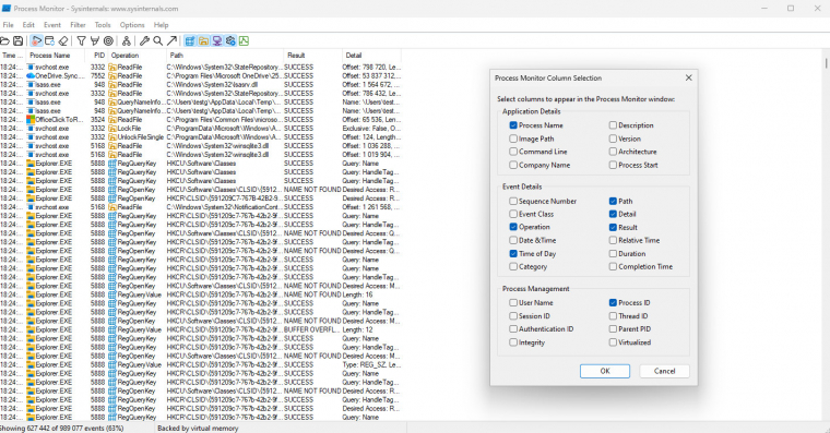 A Process Explorer a gépen futó folyamatok általános áttekintésében jeleskedik, amikor viszont úgy tűnik, hogy megvan a bűnös, akkor az adott folyamatnak már a Process Monitor segítségével tudsz jobban a körmére nézni - merthogy ez az alkalmazás nem valós idejű követésre alkalmas, hanem lényegében egy naplót készít arról, hogy az aktív folyamatok milyen rendszerműveleteket hajtottak végre. Persze alapesetben rengeteg program és programszál dolgozik a háttérben; a listát a szűrő segítségével tudod leszűkíteni az általad kiválasztott folyamathoz köthető bejegyzésekre. A hibakeresést megkönnyíti, hogy a Process Monitor a listájában kiemeli azokat a bejegyzéseket, amelyekhez hibakód is tartozik - így ha például egy app folyamatosan összeomlik, könnyebben el tudod dönteni, hogy hol kell kezdeni a vizsgálatot.