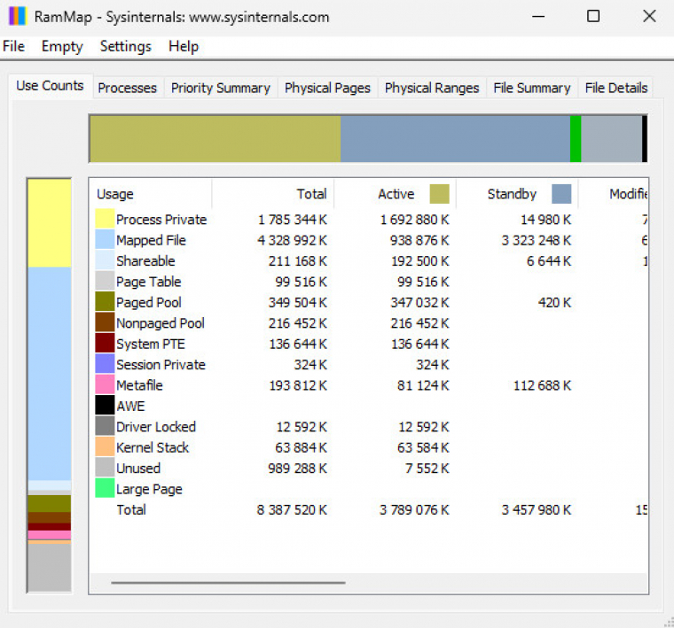 Még mindig a kritikus rendszerjellemzőknél maradva, a RamMap azt tudja megmutatni neked, hogy pontosan hogyan osztja szét a Windows a rendszermemóriát az alkalmazások között - vagy ha úgy jobban tetszik, azt látod, hogy az egyes programok mennyi RAM-ot igényelnek valós körülmények között. A RamMap esetében is igaz, hogy azokat az alapinformációkat, amiket a Feladatkezelő mutat, sokkal részletesebben taglalja - így pedig könnyebben kideríthető, ha valamelyik szoftver rendellenesen sok memóriát vont el magához. A RamMap előnye, hogy arra is lehetőséget ad, hogy a memória már nem használt, de még ki nem ürített területeit felszabadítsa - igaz, ezt mindig manuálisan kell megtenned.