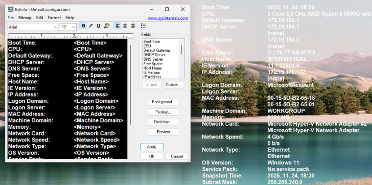 A BgInfo azért nagyon hasznos, mert ezeket az adatokat azonnal láthatóvá teszi. Természetesen tartozik hozzá egy olyan felület is, amelyen keresztül a mezők és az adatok az egyedi igényekhez igazíthatók (szövegméret, színek stb.). A program annak ellenére nem használ sok erőforrást, hogy a kért információkat dinamikusan frissíti - tehát nem arról van szó, hogy kapsz egy, a boot utáni állapotra jellemző áttekintést, ami aztán úgy marad egészen addig, amíg ki nem kapcsolod a gépet.