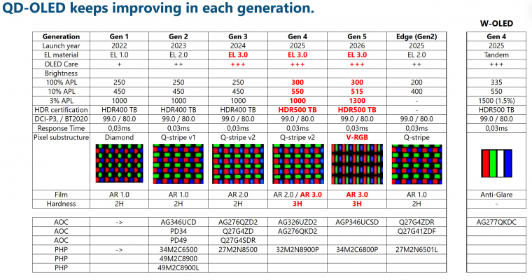 Az AGON by AOC monitoroknál a QD-OLED-technológia a 4. generációnál tart, ahol az 1000 nites csúcsfényerőhöz már VESA DisplayHDR 500 True Black minősítés is tartozik. A két új modell az AG326UZD2 és az AG276QKD2. Ezeket az év végén követi majd az 5. generációs QD-OLED panellel szerelt AGON monitor, ami már 1300 nitre képes és a modellszáma AGP346UCSD lesz.