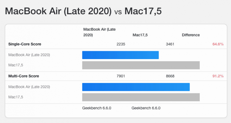 A laptop az iPhone 16 Próban bemutatott A18 Pro chipet használja, ami azt eredményezte, hogy a Geekbench tesztekben a MacBook Neo körülbelül 3461 pontos egyszálas (single-core) és 8668 pontos többszálas (multi-core) eredményt ért el. Ez valójában a becsült értékeken belül van és nem különösebben nagy meglepetés az aktív hűtés nélküli laptopban. Összehasonlításként az M1-es MacBook Pro körülbelül 2235 single-core és 7901 multi-core pontot produkált, így egyszálas teljesítményben az új chip jelentős előrelépést mutat.