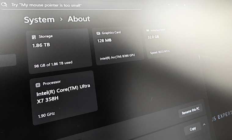 A processzorhoz LPDDR5X RAM is kapcsolódik, amiből a 32 GB bőségesen elegendő mindenféle munkához, a jelenlegi RAM-krízis közepette pedig azt is mondhatnánk, hogy ez több, mint csodálatos. Ugyanakkor azt ki kell emelnünk, hogy a RAM ebben a gépben sajnos nem bővíthető, vagyis ha ezt választod, akkor az utolsó napig, amíg használod az ExpertBook Ultrát, be kell érned 32 GB-tal. A tárhellyel il7yen gond nincsen, M.2-es NVMe SSD-ről van szó, amiből a tesztgépben 2 TB-osat találtunk. Érdemes itt azt is kiemelni, hogy a tesztgépben már PCIe 5.0-ás Samsung SSD dübörgött, és ez a szintetikus tesztek mellett a valós használat során is érezhető volt több helyen is, mint például a rendszerindulás, programtelepítés stb.