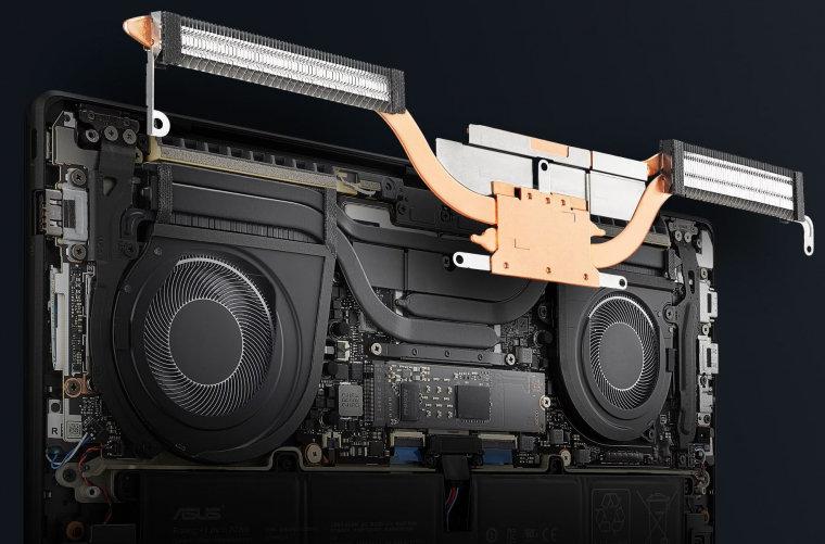 Az ASUS mérnökei az ExpertCool Pro nevet adták a kétventilátoros hűtésnek, amivel sikerült elérni a vékony gépházban is az 50 W TDP-keretet. Ennek köszönhetően a gépben a legújabb, messiásként várt (legalábbis az Intel-rajongók által) Intel Core Ultra X7 358H központi egység dolgozik. A Panther Lake kódnevű chip a legújabb 18A gyártástechnológiával készült és 16-magos. Ebből 4 a teljesítményért felel, 8 mag hatékony és alacsonyabb fogyasztású, 4 másik pedig ultraalacsony fogyasztású mag. A maximális Turbo Boost órajel 4,8 GHz lehet, van AI-gyorsító hardveres NPU modul is 50 TOPs teljesítménnyel, valamint "X"-es Core Ultra lévén egy egészen erős GPU. Ez nem a szimpla Intel Graphics modul, hanem az Intel Arc B390 grafikus egység, ami 12 Xe magot tartalmaz, 2,5 GHz-en dolgozik, képes hardveres ray tracingre, AI-számításokban pedig 122 TOPs erőt képvisel. Érdekesség, hogy a Panther Lake SoC chiplet felépítésű, és az Intel 18A technológiával csak a CPU készül, a GPU-t a TSMC gyártja N3E technológiával.