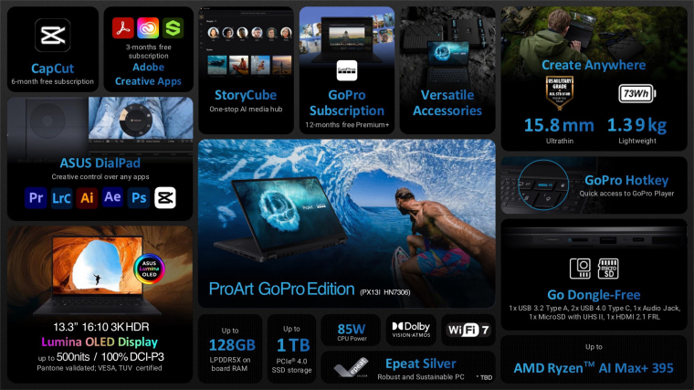 A ProArt GoPro Edition PX13 notebook dizájnját tehát a GoPro-ihlette, ami színben, kialakításban és néhány extrában jelenik meg. Ami megmaradt, az a 360 fokban hajtható zsanérra szerelt érintőkijelző, vagyis egy vérbeli hibrid laptoppal van dolgunk.