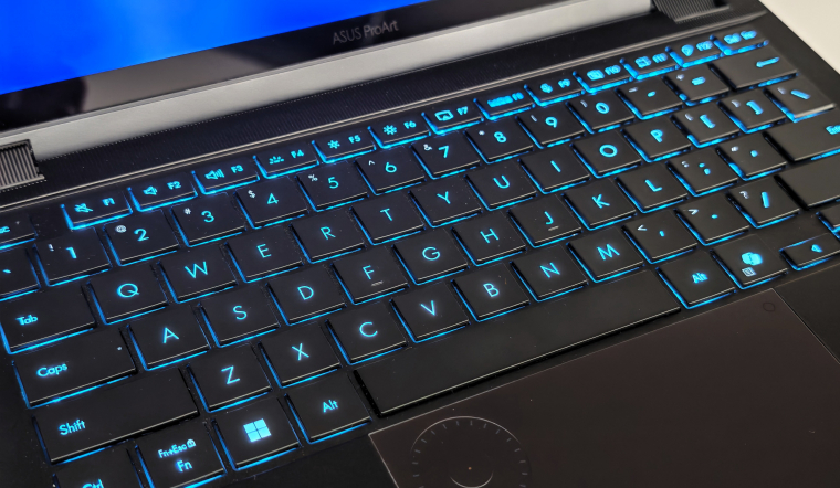 Természetesen az elmaradhatatlan logó is ott virít. Amint megnyomod, a GoPro gyorsgombot, az akciókamera-óriás lejátszója indul. Ezt az ASUS is megtámogatta néhány szoftverrel, mint például a StoryCube, ami AI segítségével segít rendszerezni felvételeidet - akár a 360-as felvételeidet is. Szintén hasznosnak találhatod az ASUS DialPadot, ami a touchpad bal felső sarkában található, speciális vezérlő. További szoftveres extra, hogy a géphez 1 év exkluzív GoPro előfizetés is jár. Extra hardveres funkció a GoPro-színű billentyűzet-háttérvilágítás, szoftveresen pedig a háttérképnek örülhetsz.