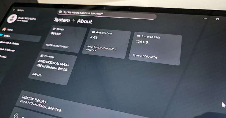 Az 1 TB-os NVMe SSD nem olyan meghökkentő, viszont a 128 GB LPDDR5 RAM tekintélyes. Ez természetesen felesleges túlzásnak tűnhet sokak számára, ám egy speciális hardverrel van dolgunk. A központi egység ugyanis képes arra, hogy az integrált GPU számára dinamikusan tetszőleges méretű memóriát foglaljon le - akár a 128 GB RAM döntő többségét is! Ez tulajdonképpen a VRAM, vagyis a GPU direktben tudja címezni, és így sokkal hatékonyabb lehet, mint akár egy GeForce RTX 5090 is, amikor csak az a fontos, hogy óriási kapacitású memóriát tudjon direktben címezni a grafikus egység.