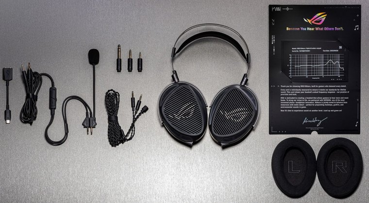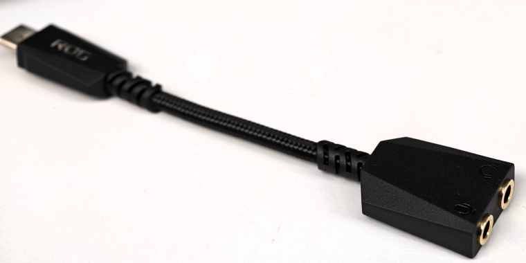 A ROG Kithara tekintélyes méretű, 100 mm átmérőjű drivereket kapott, amelyek 16 Ohm ellenállásúak, a frekvencia-átvitel pedig 8 Hz - 55 kHz. A fejhallgatót összecsukni nem lehet, csak sztereó hangzásra képes, térhangzás, applikáció stb. nincsenek és mindennel kompatibilis, aminek 3,5-es jack csatlakozója van. Ezt azért az ASUS kiegészítette egy Type-C-s hangkártyával, ami tulajdonképpen csak egy rövid átalakítónak tűnik, de a másik végén ott várnak a jack csatlakozók a mikrofonhoz és a felhallgatóhoz egyaránt.