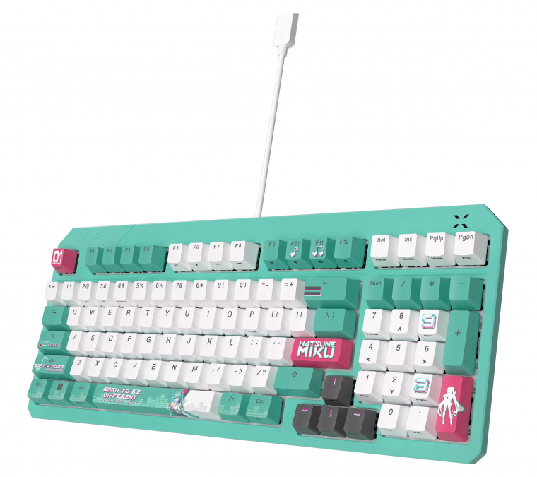 A TUF Gaming K3 Gen II Hatsune Miku Edition kompakt, 97/98 gombos billentyűzete is magán viseli a pezsdítő, fehér alapon türkiz és rózsaszín elemekből álló színkombinációt. Ez az optomechanikus kapcsolós RGB-billentyűzet ötvözi a TUF Gaming minőségét és a Miku-féle játékosságot. IP57-es tanúsítványa gondoskodik róla, hogy a billentyűzet víz- és porálló legyen: akár bele is merítheted egy méter mély vízbe 30 percen keresztül. Az optomechanikus kapcsolók n-key rolloverrel és 100%-os antighostinggal rendelkeznek, és nem kevesebb, mint 100 millió leütés élettartammal kínálnak hosszú távú megbízhatóságot.