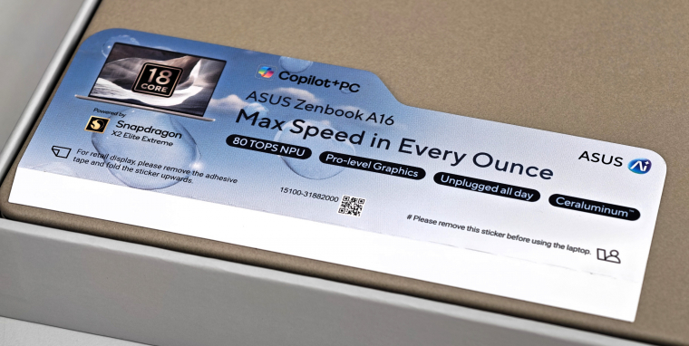 A Zenbook A16 igazi nagy dobása, hogy az AMD-Intel platformok helyett a Qualcomm legújabb fejlesztésére épül. Ez a Snapdragon X2 Elite Extreme, ami a chipgyártó legerősebb megoldása PC-khez. A központi egység 18-magos felépítésű processzora a legfejlettebb ARM-architektúrát állítja csatasorba, emellett pedig egy sokkal erősebb, 80 TOPs-ra képes Hexagon 6 NPU is bevethető AI-számítások során. A gyártó különösen büszke az új integrált Adreno X2 GPU-ra, amely elmondása szerint immáron egy átlagos hétvégi játékos igényeit is képes akár kiszolgálni. A chip 5 GHz-es boost órajelre képes, a 192 bit széles memóriabuszra pedig fixen 48 GB LPDDR5x-9600 RAM kapcsolódik. Az Extreme chip esetében ennél kevesebbre, lassabbra nincs is lehetőség. A tárhelynél még maradt a gyártó a PCIe 4.0 csatlakozásnál, a tesztgépben egy 1 TB kapacitású Samsung NVMe SSD-ről futott a Windows 11 és a tesztprogramok.