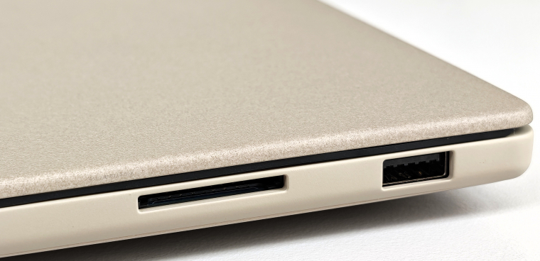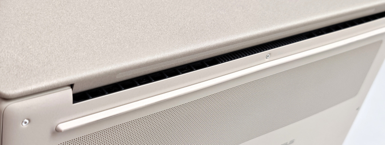 A legvékonyabb pontján 13,8, a legvastagabb részen pedig 16,5 mm-es notebook élén éppen annyi bevágás található, hogy egy ujjal, könnyedén belekapaszkodhass a fedlapba és kinyisd a gépet. Ilyenkor nem emelkedik el az alsó rész az asztallaptól, miközben a zsanér stabilan tart és kb. 135 fokig nyitható.
