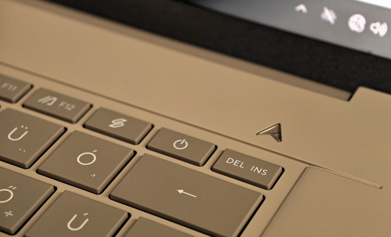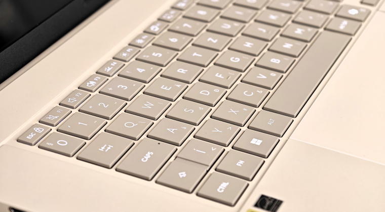 A billentyűzet magyar szitázású, háttérvilágításos és teljes kiosztású (numerikus rész nélkül). Az "ű" és az "í" osztott gombokon vannak. A gombok 1,3 mm-es útja megfelelő, a gombsapkák laposak és kényelmesek. A gépelés nem túl hangos, a kurzorvezérlők elkülönítettek és a teljes Fn sor is megvan. Persze a Copilot gombtól sem szabadulsz, de ha ez zavar, szerencsére át tudod programozni, vagy le is tilthatod a Windowsban. A touchpad nagy méretű, csendes és hajszálpontos. A felület tapintása kellemes, innen már tényleg csak a haptikus megoldás majd a logikus továbblépés. A gép teljes készülékháza zár, szellőzőnyílás csak alul, és a zsanér által takart részen található. Van két hangszóró is alul, ezek lefelé irányítottak és Dolby Atmos támogatás segít nekik erősebben szólni.