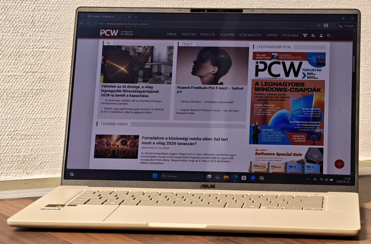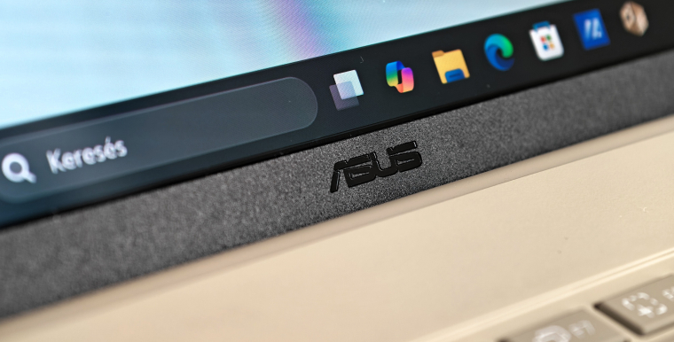 A laptopot felnyitva is egyértelmű, hogy prémium PC-vel van dolgunk, ami a MacBookok babérjaira tör, de legalábbis a többi windowsos notebookot szeretné maga mögé utasítani. No persze ez a prémium érzés nem biztos, hogy mindenkinek attól lesz meg, hogy a csuklótámaszon ott virít egy Microsoft Copilot+ PC matrica. Sajnos egy másik, zavaróbb dolgot sem értünk: az amúgy csodás és kellően nagy kijelző körül szimpla, érdesített fekete műanyag káva fut körbe. Ez a két függőleges oldalon vékony, de alul és felül vastagabb, ami kifejezetten visszalépés a korábbi Zenbookokhoz képest, ahol a kijelzőt védő üveg egészen a fedlap pereméig ki volt húzva. Azt sem értjük, miért kellett az alsó, fekete műanyag keretre még egyszer kiírni az ASUS nevet - szerencsére ez fekete alapon fekete, így sok vizet nem zavar.