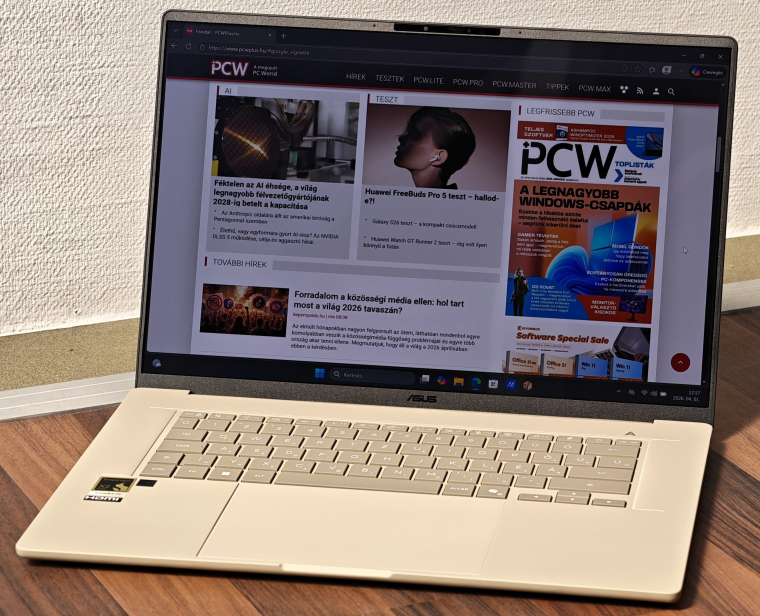 Az ASUS jól végezte a házi feladatát: a Ceraluminium már bizonyított, a Zenbook A16 kialakítása jó, kényelmes a billentyűzet, szuper a kijelző és a touchpadra, illetve a portkínálatra sem lehet panasz. A bézs szín különleges, de mi azért nagyobb színválasztékot vártunk (fehér, fekete, kék, vagy esetleg valami vad megoldás?), valamint a kijelzőt körbeölelő fekete káva is szerencsétlen dizájndöntés. A teljesítmény arra, amire a gépet kitalálták, tökéletes, akadást, lassulást, várakozást nem tapasztaltunk, sőt, kompatibilitási problémába sem ütköztünk.