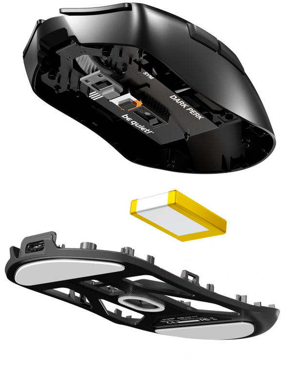 A kevesebb néha több elv szerint alakították ki a mérnökök a Dark Perk Sym dizájnját. Ennek eredményeként az egér már bevált és bizonyított kialakításbeli megoldásokat kapott, és bár szinte szimmetrikusnak tűnik, valójában jobb kézbe illik. A tervezés során az e-sportolókat, hardcore gamereket vette célba a be quiet!, így nem is volt kérdéses, hogy a tömeget minimálisra kell csökkenteni. A Dark Perk Sym így 56 gramm lett (az Ergo 55 gramm), mégpedig úgy, hogy ehhez nem vetették be a méhkaptár szerkezetű felső borítást, és nem spóroltak a gombokon, vagy a belső felépítésen sem.