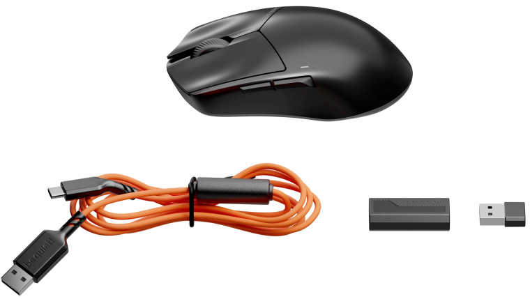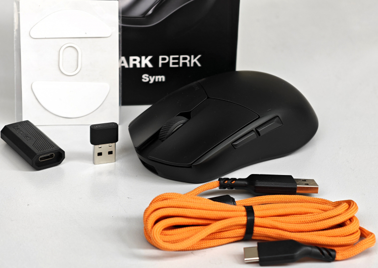 A dobozban csak a legszükségesebb kiegészítőket találod. A koromfekete egérhez kapsz egy 1,8 m hosszú, narancssárga harisnyázott Type-A - Type-C kábelt, egy vezeték nélküli USB-s vevőegységet, némi leírást és egy extra szett, méretre vágott PTFE talpat.