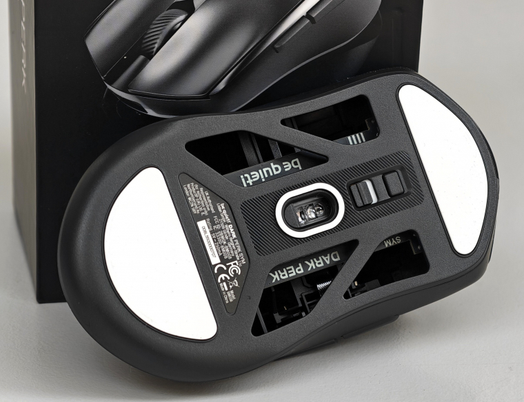 Ha már alul járunk, fontos tulajdonsága a Dark Perk Symnek a két, nagy méretű 100% PTFE talp, amelyeknél még arra is odafigyeltek, hogy ezek éleit elvékonyították. Szintén PTFE gyűrű került a szenzor köré, ami jól néz ki és nem mellesleg a stabil csúszást is segíti.