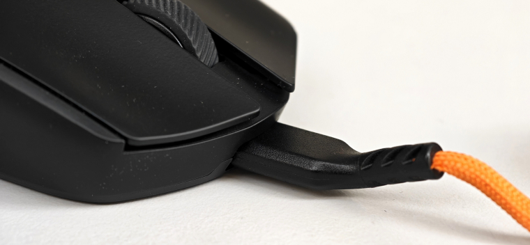 A narancssárga USB-kábel kellemesen feldobja a látványt, bár az tény, hogy ennél hajlékonyabb, kevésbé merev egérkábelt is kaptunk már több gyártótól is. Az viszont dicséretet érdemel, hogy az egérbe csatlakozó, az átlagosnál valamivel hosszabb Type-C dugasz az asztallaptól felfelé vezeti ki az USB-kábelt. Így oldották meg a tervezők, hogy kábeles módban se okozzon gondot a kábel súrlódása az egérpadon.