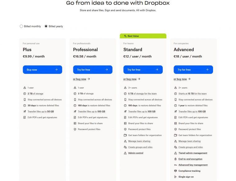 Cipőt csakis cipésztől - tartja a mondás, így jogosan illesztik ezt sokan a felhőtárhelyekre is. Ha pedig kifejezetten online fájltárolásra szakosodott céget választanál, akkor a Dropbox a legismertebb ilyen. Ugyanakkor az ingyenes fiók itt tényleg csak ismerkedésre elegendő, hiszen mindössze 2 GB-os és egyéb korlátokkal is meg kell küzdened. Ha előfizetsz, a legkisebb csomag is 10 euró/hónap, viszont cserébe mindjárt 2 TB tárhelyet kapsz. Ennél alig drágább, 12 euró/hónap a Standard csomag, amiben már 5 TB tárhely van és több felhasználóval közösen is használhatod a szolgáltatást, sőt, rengeteg extra funkcióhoz is jutsz.