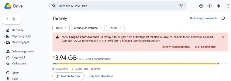 Amikor Google fiókot hozol létre, nem csupán egy e-mail címet kapsz: a Google fiók számtalan "ingyenes" online szolgáltatás előtt nyitja meg az utat. Ilyen az irodai csomag, a Fotók, a térképszolgáltatás és még hosszan sorolhatnánk. Ezek mellé 15 GB tárhelyet is kapsz a Google felhőjében. A tárhely - bár a többi szereplőhöz mérten nagyvonalúan bőségesnek tűnik - egyáltalában nem sok, hamar betelik, és máris minden lehetséges csatornán szembesít a Google, hogy válassz egy Google One előfizetést. A kisebb, 100-200 GB-os csomagok nem is kerülnek túl sokba, de ezzel megint csak ideig-óráig leszel el, hamarosan ezt is felemésztik fájljaid, pláne akkor, ha videózol és/vagy családi fiókhoz rendeled a tárhelyet.