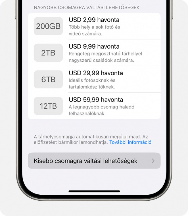 Lemondás: Az Apple nem vár a hónap- vagy évfordulóval: ha lemondod az iCloud+ előfizetésedet, azonnal életbe lép a változtatás, de persze részarányosan nem kapsz vissza pénzt az előfizetési díjadból. Automatikusan a szimpla iCloud 5 GB-os csomagba lépsz vissza.