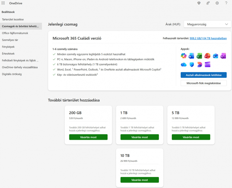 Az Apple-höz hasonlóan a Microsoft is csupán 5 GB tárhelyet biztosít ingyenes MS-fiókodhoz, ami édeskevés. Erre a fiókra márpedig szükséged van akkor is, ha Windows 11 felhasználó vagy, esetleg Microsoft 365 irodai szoftvercsomagot használsz, vagy az Edge böngészővel szörfölsz a neten. A Microsoft nagyon gáláns, amennyiben előfizetsz nagyobb tárhelyre, vagy valamely szolgáltatására. Például a Microsoft 365-höz (korábban Office 365) 1 TB felhőtárhelyet is kapsz, ha pedig 5-felhasználós családi csomagot veszel, 5x1 TB jár. A Windows 11 is aktívan kihasználja a felhőtárhelyet, ide menti például a géped biztonsági mentését, a BitLocker titkosítási kulcsot, a OneDrive appot telepítve pedig mobilod is készíthet ide azonnali, automatikus biztonsági mentést minden képedről és videódról.
