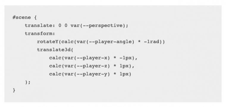 Mivel a CSS-ben nincs valódi kamera, azt találta ki, hogy itt nem a játékos mozog a világban, hanem az egész világ mozog a játékos körül. A JavaScript néhány egyedi CSS-változóban tárolja a játékos pozícióját és irányát, a CSS pedig ezek alapján eltolja és elforgatja a teljes pályát.