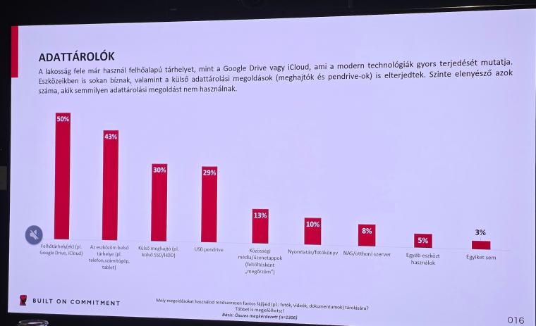 Pedig az adatbiztonság már szimplán azzal is javítható lenne, ha a felhasználók tudatosan használnák a rendelkezésükre álló adattárolókat. Ez lehet felhő (amiben meglepően sokan, a megkérdezettek fele bízik), külső meghajtó, pendrive vagy akár NAS is - bár utóbbit nagyon-nagyon kevesen ismerik és használják.
