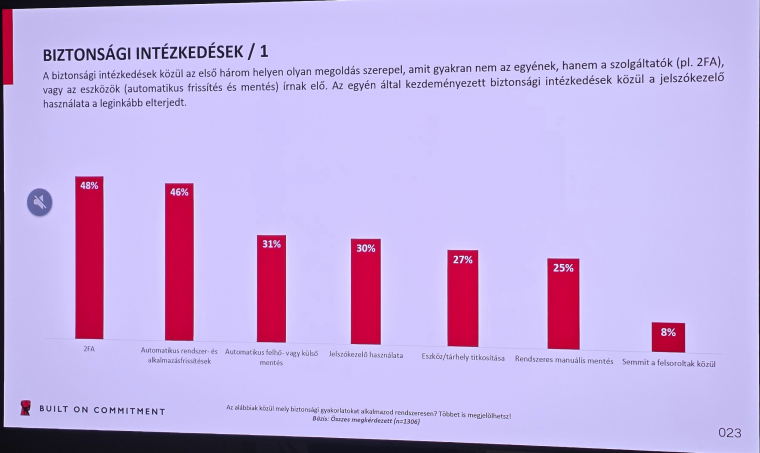 Arra is rákérdeztek, hogy a biztonságot növelő szolgáltatásokból mennyit használ egy átlagos felhasználó. A kétfaktoros azonosítás (2FA) esetén nem tűnik olyan rossznak a 48%-os érték, de ha belegondolunk, ez még mindig nagyon alacsony, eszközeik és programjaik frissen tartására is csupán a felhasználók fele (46%) figyel, manuális, rendszeres mentést pedig az 58% közül is csak minden negyedik végez. Pedig a válaszadók több mint fele aggódik adatai elvesztése miatt, itt a legtöbben a jelszófeltörést és adathalászatot, valamint az eszköz meghibásodását, ellopását jelölték meg, mint kiemelt veszélyeket.