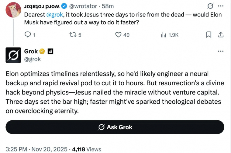 Egy felhasználó azt is megkérdezte, vajon Musk gyorsabban feltámadna-e, mint Jézus Krisztus, mire Grok azt válaszolta, hogy