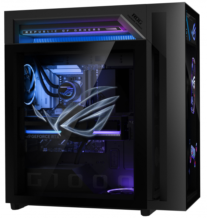 A hűtést a speciális látványelem nem befolyásolja, ehhez a 104 literes házba egy ROG Thermal Atrium nevű, 420 mm-es AiO folyadékhűtést szerelt be az ASUS. Sajnos a bejelentésből nem derült ki, hogy pontosan milyen processzor hajtja a gépet, de a GPU-nál viszonylag nagy mozgásteret kapsz: a ROG Astral GeForce RTX 5070 Ti/5080/5090 mellett AMD Radeon 9070XT-t is választhatsz, a rendszermemória 128 GB is lehet, a tárhely pedig 4 TB-os PCIe 5.0 SSD.