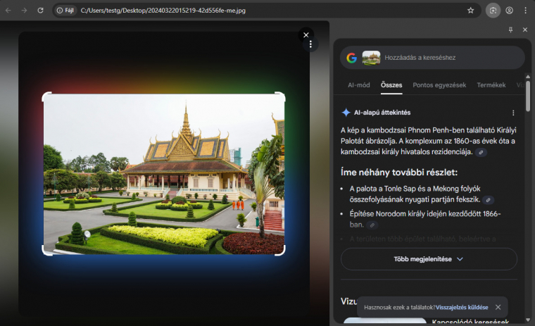 Mindez szép és jó, de mi a helyzet akkor, ha valamilyen általános feladatot szeretnél elvégezni? Mondjuk találsz egy szép fotót az interneten, és arra vagy kíváncsi, hogy az mit is ábrázol. Hát persze! Csak töltsd be a böngészőbe a fotót, és az AI máris löki magából az eredményeket. Vagy a sületlenségeket, amint azt a mellékelt ábra is mutatja. És ez nem hiba, a kérdést többször, eltérő formában is feltettük, de a Comet ragaszkodott ahhoz, hogy a fotó egy számítógépet és munkakörnyezetet ábrázol. Mindeközben a Chrome egy sima internetes kereséssel az alábbi eredményt produkálta ugyanezzel a képpel…