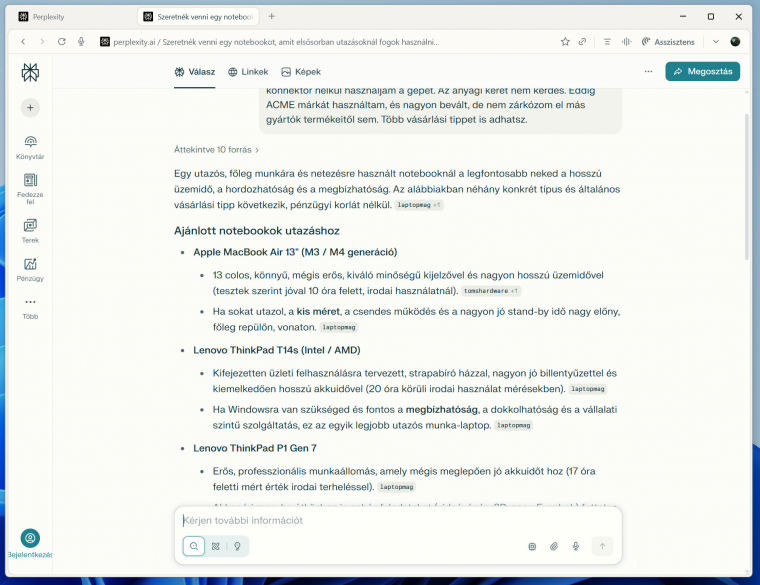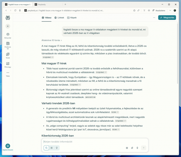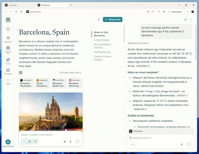Fenti tapasztalatokat a Comet böngésző használata során szereztük, amely a Perplexity mesterséges intelligenciáját használja. Noha más AI-böngészők is elérhetők a piacon, szakértők egyöntetű véleménye alapján a kutatás jellegű feladatokhoz a Perplexity AI a legjobb választás - így pedig adja magát, hogy a Comet az, amelyik az AI előnyeit a legjobban képes kiemelni. A Comet a prompt feldolgozása és a válasz kialakítása során az oldalsávban folyamatosan mutatja, hogy mit csinál éppen, és a fontos információkat bármikor ellenőrizheted is, hiszen forrásmegjelölést is használ. Ez növeli a bizalmat, de természetesen az eredmények pontosságát nem garantálja.