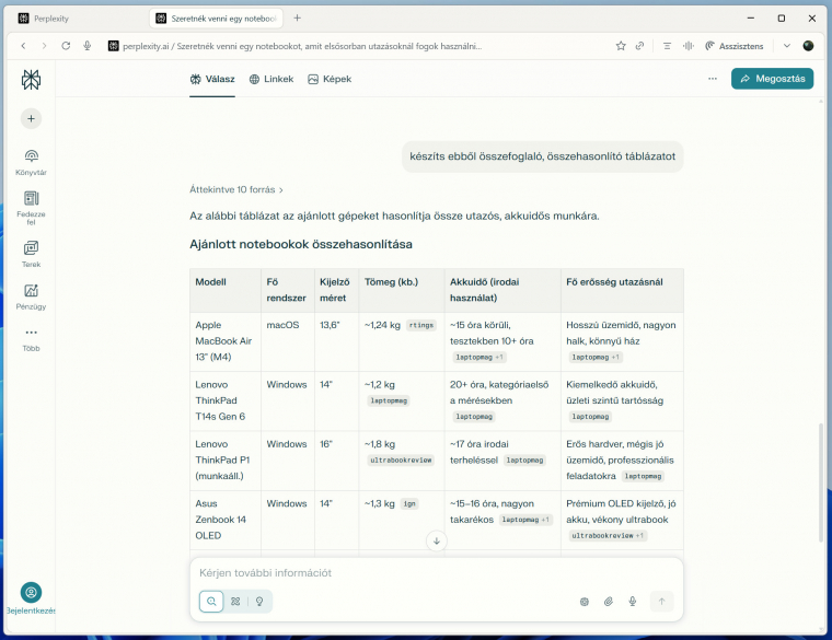 Mi történt a fenti példa alapján a promtolásunkat követően? A Comet nyolc lépést hajtott végre, 2-3 perc alatt. Először is megnyitotta a pcwplus.hu-t és észrevette, hogy az oldal keresési lehetőséget is kínál. Ám a keresőt használva nem kapott olyan találatot, ami konkrét notebookot ajánlott volna, ezért továbblépett, és 20 nemzetközi oldal (pl. PCMag, rtings, laptopmag) segítségével átnézte az aktuális teszteket, és leszűkítette a kínálatot néhány típusra (ASUS Zenbook A14 és S13 OLED, Lenovo ThinkPad T14s és X13, valamint MacBook Air M4). Ezekről a gépekről korrekt összefoglaló táblázatot is készített, kiemelve az egyes típusok legfontosabb előnyeit és hátrányait. Viszont a típusneveknél itt-ott belehibázott az AI és az árakat sem tudta korrektül összehasonlítani - külön kérésre utóbbit megtette, viszont így rejtélyes módon új típusok is bekerültek az összehasonlításba. Az AI szerint a végső nyertes viszont meglepő módon az ASUS Zenbook A14 lett, ami tudva, hogy a gép nem x64, hanem ARM alapú, azért egyesek számára még megkérdőjelezhető döntés. Ugyan az ARM processzor tényét nem hallgatta el a Comet, azt viszont már nem emelte ki, hogy ennek milyen előnyei és hátrányai lehetnek a mindennapi használat során - azaz ha valaki laikus szemmel vakon követi, amit az AI ajánlott (és a boltban sem szólnak neki a lehetséges problémákról), az okozhat némi homlokráncolást a későbbiekben.
