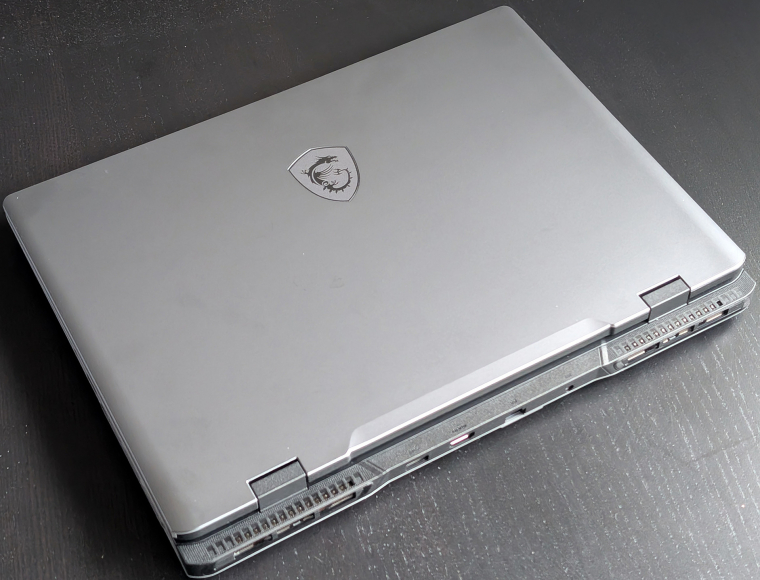 Az MSI Sword 16 HX B13V notebookjának külseje igyekszik nem magára vonni a tekinteteket - már ami a felesleges LED-csíkokat és egyéb feliratokat jelenti. A fedlap letisztult, csupán az MSI Gaming logója díszíti laptopot, amelynek a zsanérját a gép hosszanti élétől beljebb helyezték el. Ez a kialakítás jobb hűtési megoldást enged meg odabent, emellett a hátsó élre kerülhettek a vastagabb kábelt igénylő portok, mint például a tápellátás, a LAN és a HDMI (azért egy extra normál Type-A USB 3.2 Gen1 is van).