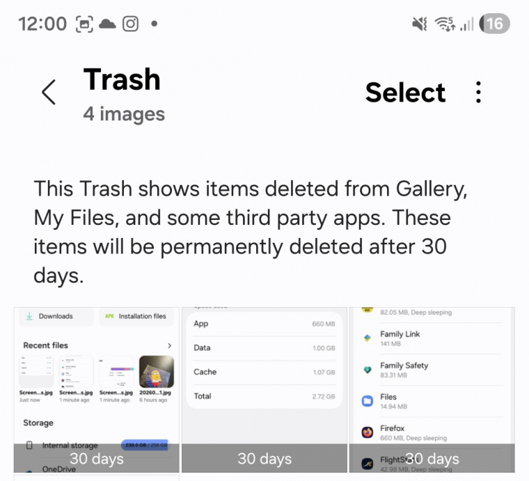 Elég sok okostelefon a Windowshoz hasonlóan beépített lomtárral rendelkezik, ami azt jelenti, hogy a törölt fotók, törölt videók és más törölt fájlok nem tűnnek el azonnal, első körben csak a kukába kerülnek. Ennek célja az, hogy elkerülhető legyen a véletlen törlésből adódó fájlvesztés. A lomtárból a rendszer egy idő után - jellemzően 30 nap elteltével - automatikusan törli az adatokat, így a tárhely felszabadul. De nem azonnal; ez magyarázza, hogy miért látsz még mindig csupán pár GB szabad helyet a telefonon akkor, amikor épp az imént töröltél 50 videót.