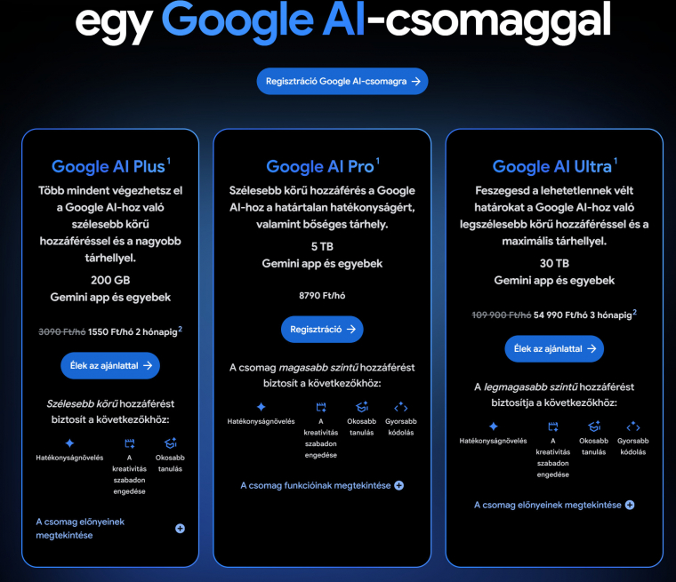 Ha bármilyen Google szolgáltatást használsz, egészen biztosan szembe jött már veled valamilyen előfizetési ajánlat. Ez többnyire az igen szűkös, ingyenes tárhelyed bővítését takarja, ám ha csak egy kicsit is feljebb tekintesz az ajánlatokban, vagy használtad már a Gemini Google AI-megoldását, az AI-előfizetési csomagokkal is szembesülhettél.