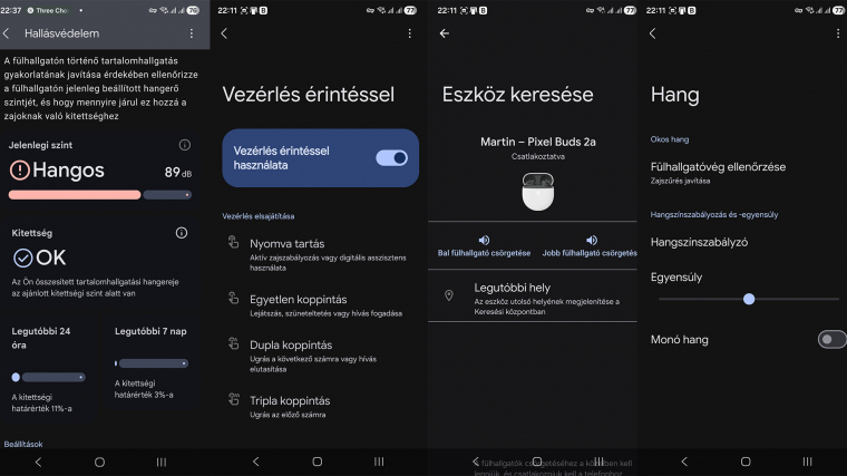 Az extra funkciók között találod még a fülhallgató megkeresésének lehetőségét, sőt, ha be vannak kapcsolva, a közelben meg is szólaltathatod egyik-másik füldugót. A másik hasznos szolgáltatás a Hallásvédelem. Ez nem csupán figyelmeztet, ha hosszú ideig túl magas hangerőn hallgatsz tartalmat, hanem azt is figyeli, hogy mekkora a zajkitettséged, és erről napi, heti jelentést is készít.