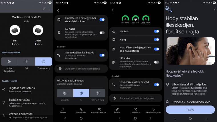 A Pixel Buds 2a kényelmes, sport közben is stabilan ül a fülben és tényleg semmi nem tud beleakadni. A hangzás nem fenomenális, de nem is csapnivaló. A sztereó hangzás szép, a színpad nagy, jól elhatárolt a két oldal. A közepekre nagyon odafigyeltek, ezek tiszták, viszont a magasak kissé tompának érződnek. Érdekesség, hogy kikapcsolt zajszűréssel a magashangok is tisztábban szólnak. Mélyek vannak, de nem szuperbasszust kell várni a 4,7 grammos fülhallgatóktól. Az EQ-ban egy kicsit tudsz ezen árnyalni, de inkább érd be azzal, hogy bár a mélyhangok csak átlagosak, legalább tiszták, nem torzítanak.