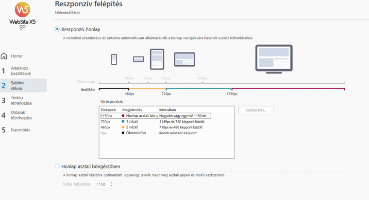 A tervezés, kreatív folyamat során egyszer sem beszéltünk még olyasmiről, mint például a reszponzív felépítés, pedig ez az egyik alapszolgáltatása a WebSite X5 Go 2025-ös verziójának. Ez annyit tesz, hogy te asztali módban tervezed meg oldaladat, a program pedig olyan kódot generál mögé, ami figyeli, hogy milyen kijelzővel szerelt eszközön fogják azt megnézni, majd ehhez is igazítja a dizájnt. Vagyis a weboldalad szuperül fog mutatni asztali böngészőben, mobilon és tableten egyaránt.