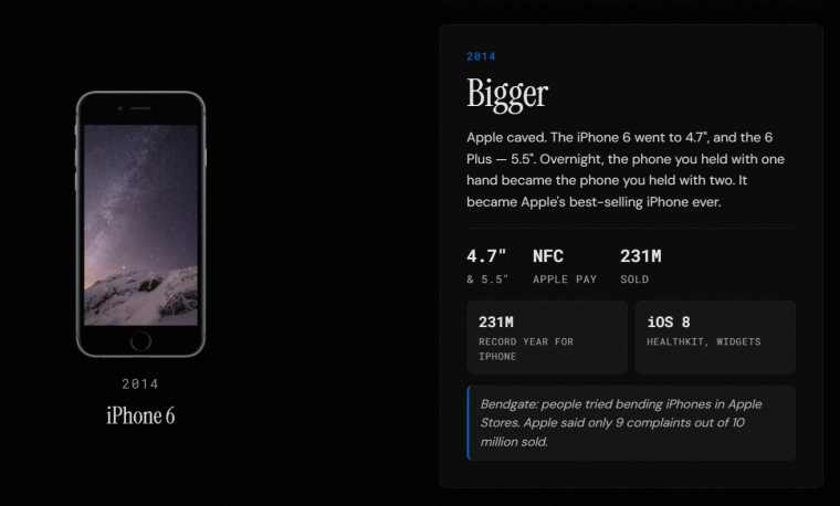 Az interaktív felület több szakaszra tagolódik. Az első részben az összes iPhone-modell egymás mellett látható, méretarányosan, eredeti háttérképeikkel, nevükkel és megjelenési évükkel. Ezt követően 11 olyan mérföldkőt emelnek ki, amelyek meghatározták a készülék fejlődését - például a Retina kijelző bevezetése, az első nagy méretű modell, az iPhone 6 Plus megjelenése, valamint az iPhone X debütálása.