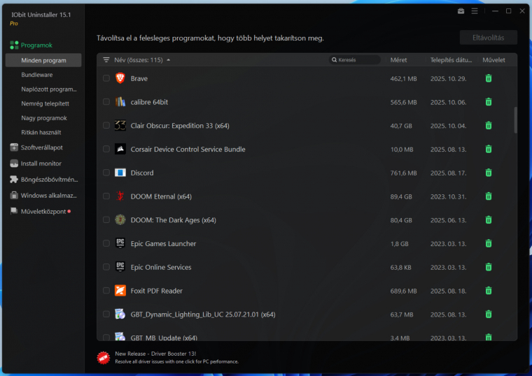 Az IObit egyik legnépszerűbb programja az Uninstaller 15 Pro alkalmazás, ami kifejezetten egy határozott célt szolgál: kitakarítani gépedről a szükségtelen dolgokat. Ehhez alapértelmezetten a Windows beépített szolgáltatását használja a felhasználók nagy többsége, ám ez gyakran nem elég alapos. Hiába távolítod el gépedről a szükségtelennek ítélt programot, a beépített rutin felületes munkát végez csupán. Az indítóikon eltűnik a Start menüből, a programok listájában sem lesz ott a letörölt szoftver, de ettől még a rendszermeghajtódon több helyen is maradhatnak félig üres könyvtárak, egy nagy halom gyorsítótárazott adatszemét, és a rendszerleíró adatbázisban is ott maradnak a program nyomai.