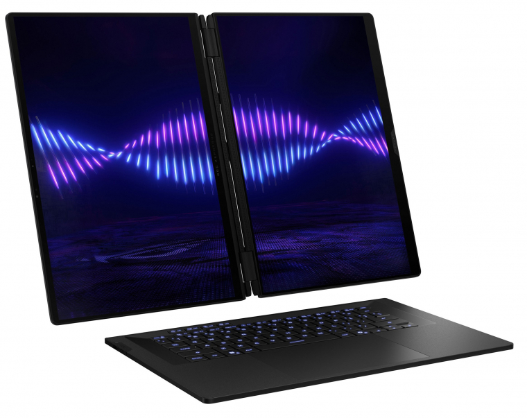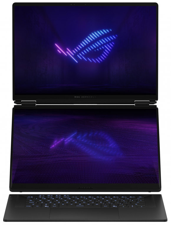 A Zenbook Duo már nem ismeretlen laptop: extrája, hogy nem egyetlen, hajlítható OLED-panel adja a hajtogatható notebook kijelzőjét, hanem két, hagyományos panelből áll a nagy asztalfelület. A dizájn fő lényege, hogy kevésbé kényes a fizikai behatásokra, emellett olcsóbban megépíthető. Hogy tartalomgyártás, munka, programozás stb. során ennek mekkora értelme van, talán nem kell hosszasan ecsetelni, viszont az már kérdéses, hogy miért gondolták úgy az ASUS mérnökei, hogy játékhoz is jól passzol ez a fajta felépítés.