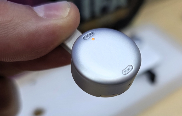 Talán a legérdekesebb eszköz mind közül a SoundCore Work D3200 AI Voice Recorder volt, ami nem nagyobb, mint egy 10 forintos, vastagsága pedig 1 cm körül van. Az apró eszközön két mikrofon található, valamint egyetlen nyomógomb, és arra képes, hogy nagyjából 8 órán keresztül rögzít minden hangot. A dupla mikrofonnak köszönhetően a minőség és zajszűrés egészen jó, az emberi beszéd például kiválóan hallható.