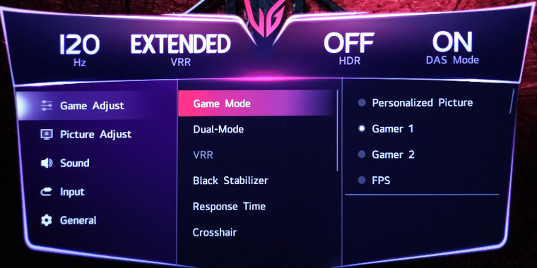 Tekintve, hogy a monitort az LG játékokhoz ajánlja, a menüben helyet kapott néhány olyan opció is, ami játék közben lehet hasznos. A Black Stabilizer a sötét részek világosításával kiemeli az árnyékban lévő ellenfeleket, van célkereszt, a monitor folyamatosan és valós időben tudja mutatni az aktuális képfrissítési frekvenciát is, a választható képarányok között pedig találsz egy speciális, 24 colos szimulációs módot. Ha ezt bekapcsolod, az elektronika csökkenti a látható képméretet, ami játékoknál azért lehet előnyös, mert nem kell annyit mozgatni a fejed és/vagy a szemed ahhoz, hogy a kép minden szegletét belásd.