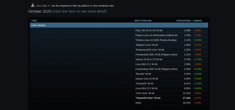 Az anekdotákon túl a Steamnek erről már adatai is vannak. A világ legnépszerűbb PC-s gaming platformja rendszeres felméréseket tart a játékosok felszereléseiről, és ezeken jól látható, hogy a Linux részesedése egyre magasabbra kúszik. Steamről lévén szó az alapvető feltételezések a SteamOS felé terelnék a gyanúinkat, de a táblázat ennél jóval összetettebb. A SteamOS ugyanis "csak" a Linux felhasználók 27,18 százalékát teszik ki. Ami viszont ennél is meglepőbb, hogy a második legnépszerűbb operációs rendszer a táblázatban az a híresen bonyolult Arch Linux 10,32 százalékkal. Utána jönnek azok, akikre számítanál: Ubuntu, Mint, Bazzite és társai.