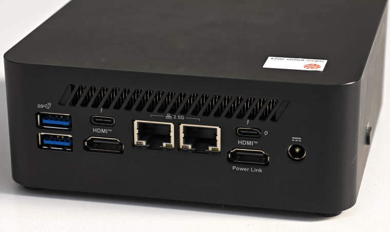 Hátul alig akad szabad felület. A szellőzőnyílás alatt, középen két darab, 2.5 GbE LAN portot, további két Type-A USB-t, két Type-C-t, két HDMI-t és egy tápcsatlakozást tudsz munkára fogni. A 4 darab normál USB port elegendő komolyabb munkához is, a speciális hálózati követelményeket pedig a két RJ45 szépen kielégíti. Ami igazán izgalmas, az az egyik HDMI és az egyik Type-C port. A normál HDMI 2.1 csatlakozás és Thunderbolt 4 vezérlőre kapcsolt Type-C mellett a másik HDMI 2.1 támogatja az MSI saját Power Link technológiáját támogatja, a másik, szintén TB4-es Type-C port pedig asztali PC-től rendkívül szokatlan módon a 100 wattos PD-in technológiával kompatibilis.