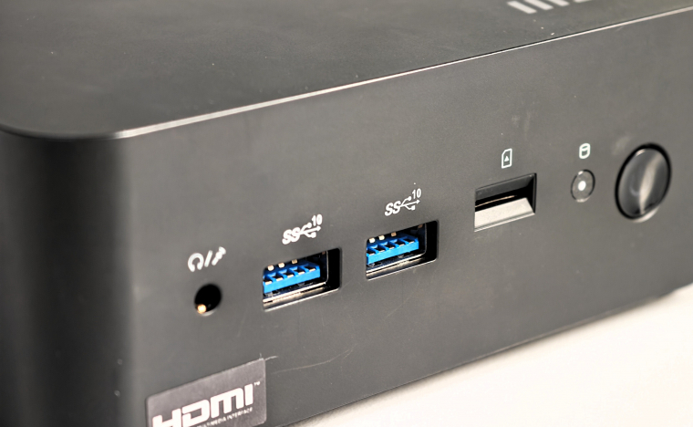 Az MSI Cubi NUC 1M abszolút csicsamentes, funkcionális külsőt kapott. Fekete, jelentős részben újrahasznosított műanyag házának függőleges élei lekerekítettek, az asztalon apró gumilábakon áll, mérete pedig mindössze 135x135x50 mm. A ház két oldalán csak Kensington zárhoz passzoló nyílást és egy speciális duplatüskét találsz süllyesztve (erről később bővebben beszélünk). A portok áradata elöl és hátul fogad - pont ott, ahol az ideális. Elöl a bekapcsoló gomb mellett HDD-LED-et (SSD-LED), microSD kártyaolvasót, 2 darab normál USB 3.2 Gen2 portot és egy kombinált jacket találsz.