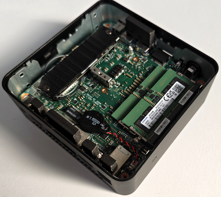 Szintén fontos egy ilyen gép esetében, hogy rendkívül könnyen szervizelhető legyen. Ez az MSI Cubi esetében is adott, mindössze a négy lábnál található négy csavart kell kicsavarnod (apró, de kellemes figyelmesség, hogy ezek rögzített csavarok, nem gurulnak el mindenfelé szerelésnél sem). A gép alját leemelve (amúgy a friss levegőt is itt szívja be az aktív, egyventilátoros hűtés) pár centiméter mélységig szinte semmi nincsen, csupán a két SO-DIMM és a két M.2 foglalat emelkedik ki magasabbra. Az egyik M.2 helyre 2280-as SSD-t szerelhetsz, amihez hűtőborda is jár, a másik pedig 2242-es adattárolót képes fogadni, ha a kétmeghajtós felépítés elvárás. Annyi hely itt azért nincsen, hogy 2,5"-os HDD/SSD-t is beépíts. A ház másik felében a DDR5 SO-DIMM modulokat fogadó két foglalatot találod - vagyis a RAM- és SSD-csere mindössze pár perces folyamat. A figyelmes tervezés része, hogy amennyiben Kensington zárral van helyhez rögzítve a gép, még szétszerelni sem tudod anélkül, hogy kettétörnéd a házat.