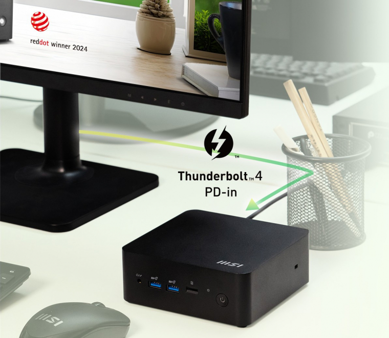 Miután egy ilyen mini PC-t sokszor speciális helyen vetnek be, illetve irodában monitor hátuljára, bútor falára stb. rögzítik, praktikus figyelmesség, hogy a gépház oldalába süllyesztett tüskékre egy szimpla bekapcsoló gombot kapcsolhatsz. Ezzel kivezetheted szinte bárhova a ki/bekapcsoló nyomógombot, nem kell például a monitor hátuljánál vagy az asztal alatt kutakodnod minden alkalommal. Ennél is elegánsabb, ha kihasználod az MSI HDMI Power Link technológiáját, igaz, ehhez megfelelő MSI monitor is szükséges. Ha ezek adottak, a monitor képes kapcsolni a PC-det is, ami még kényelmesebb. Végül a PD-kompatibilis Type-C-t említsük meg, amin keresztül a videókimenetet, adatátvitelt és töltést is el tudod intézni egyetlen kábellel. Ilyen monitorból már többfélét is találsz a piacon, így elegáns, egykábeles csatlakozással minden szükséges kapcsolatot megoldhatsz.